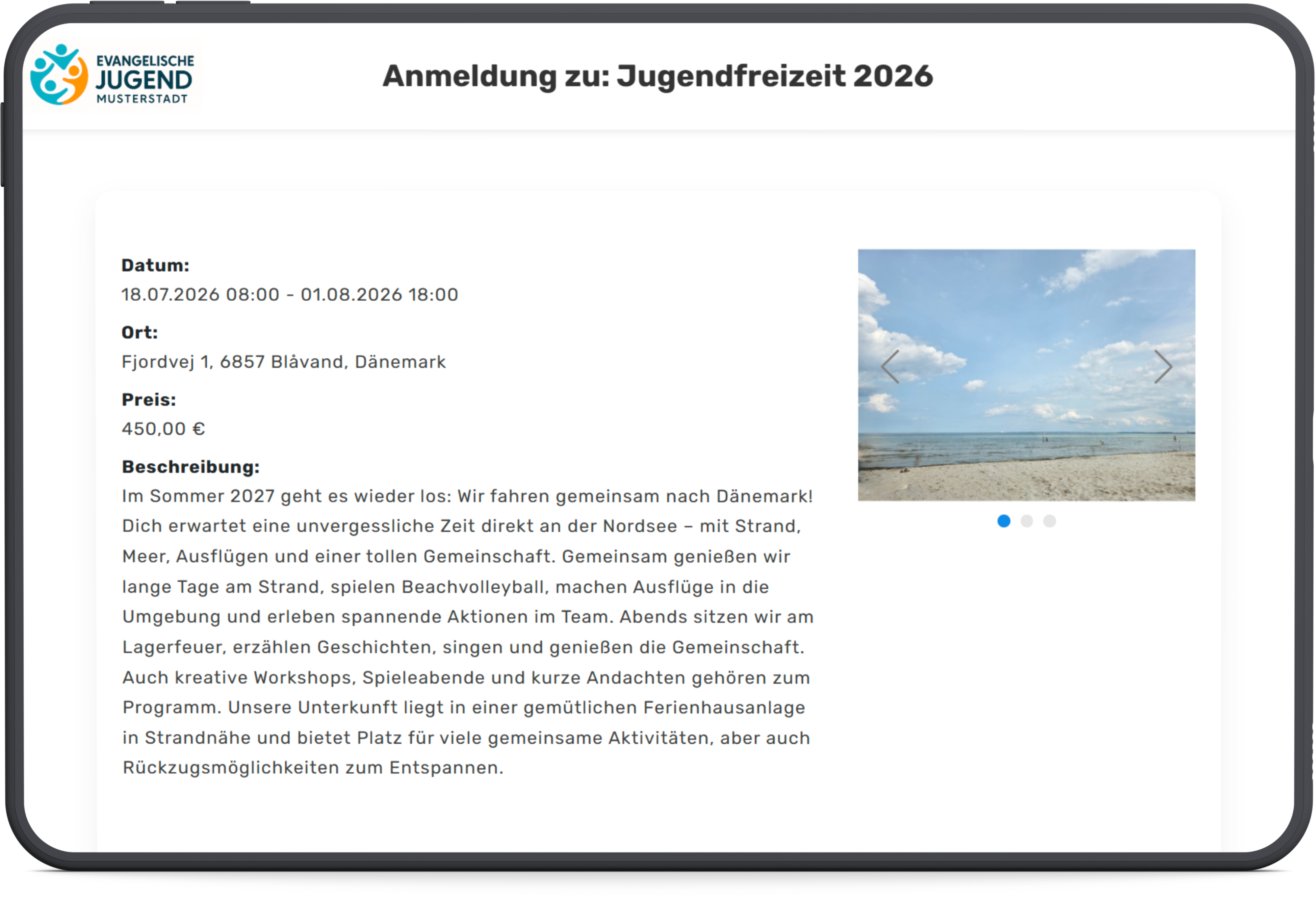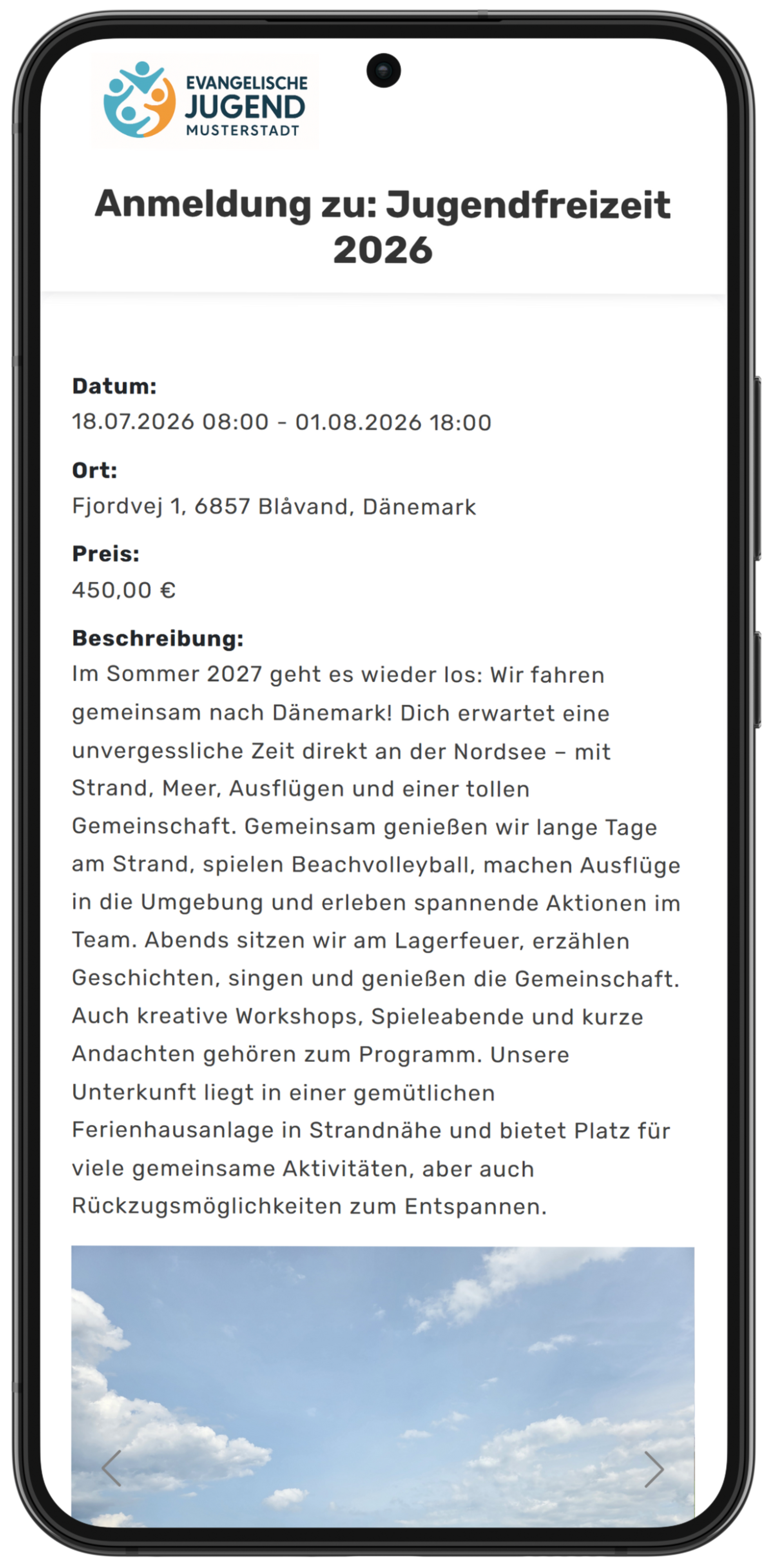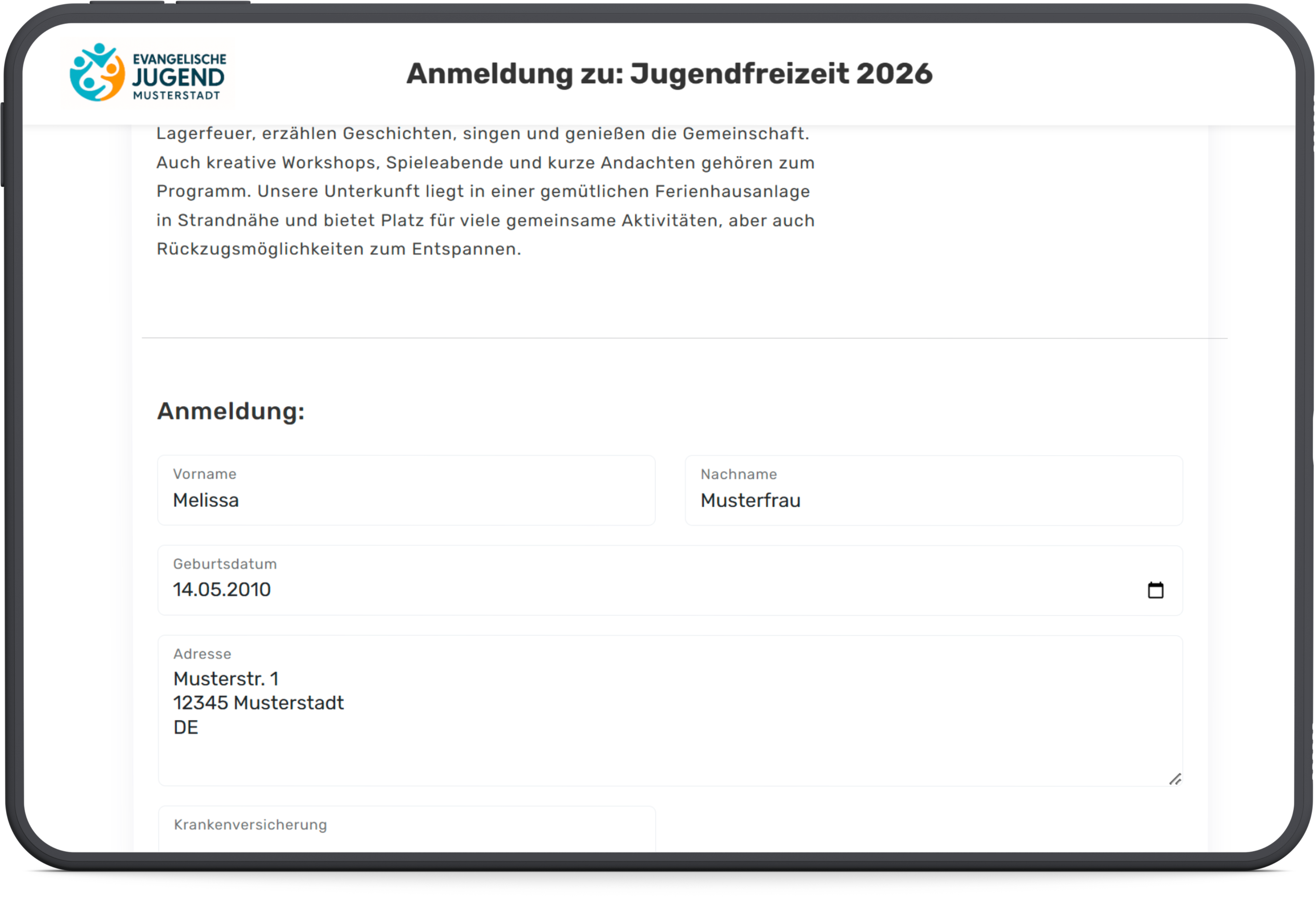 Mit dem digitalen Formular-Builder erstellst du individuelle Online-Anmeldungen für jede Veranstaltung – ob Jugendfreizeit, Konfirmand*innentag oder Aktionstag. Alle Anmeldungen landen automatisch und übersichtlich im System. Das spart dir Zettelwirtschaft und vereinfacht die Verwaltung.