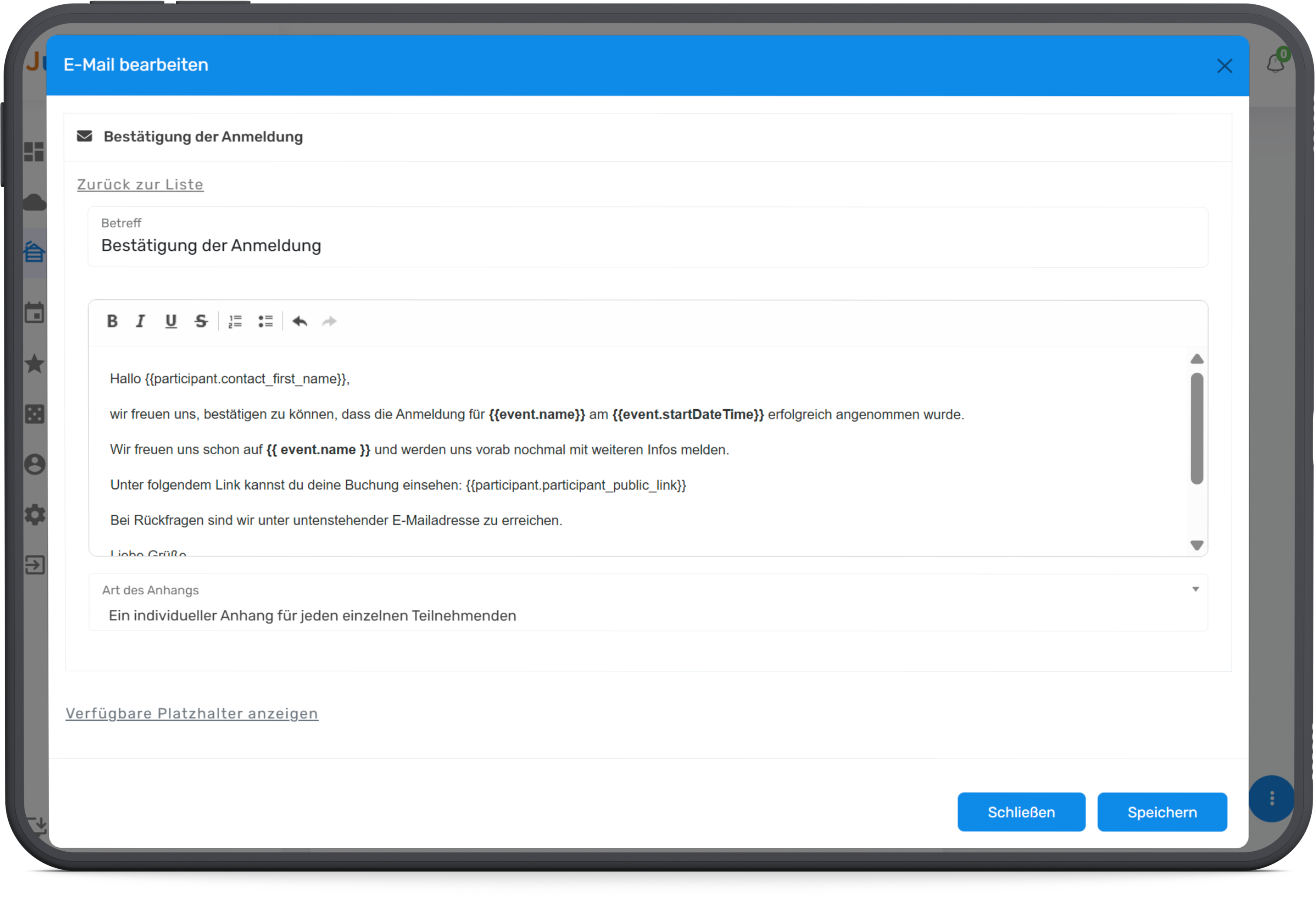Die E-Mails kannst du ganz einfach mit eigenen Texten versehen. Durch Platzhalter für Namen, Veranstaltungstitel und weitere Angaben bleiben die E-Mails trotzdem stets persönlich.
