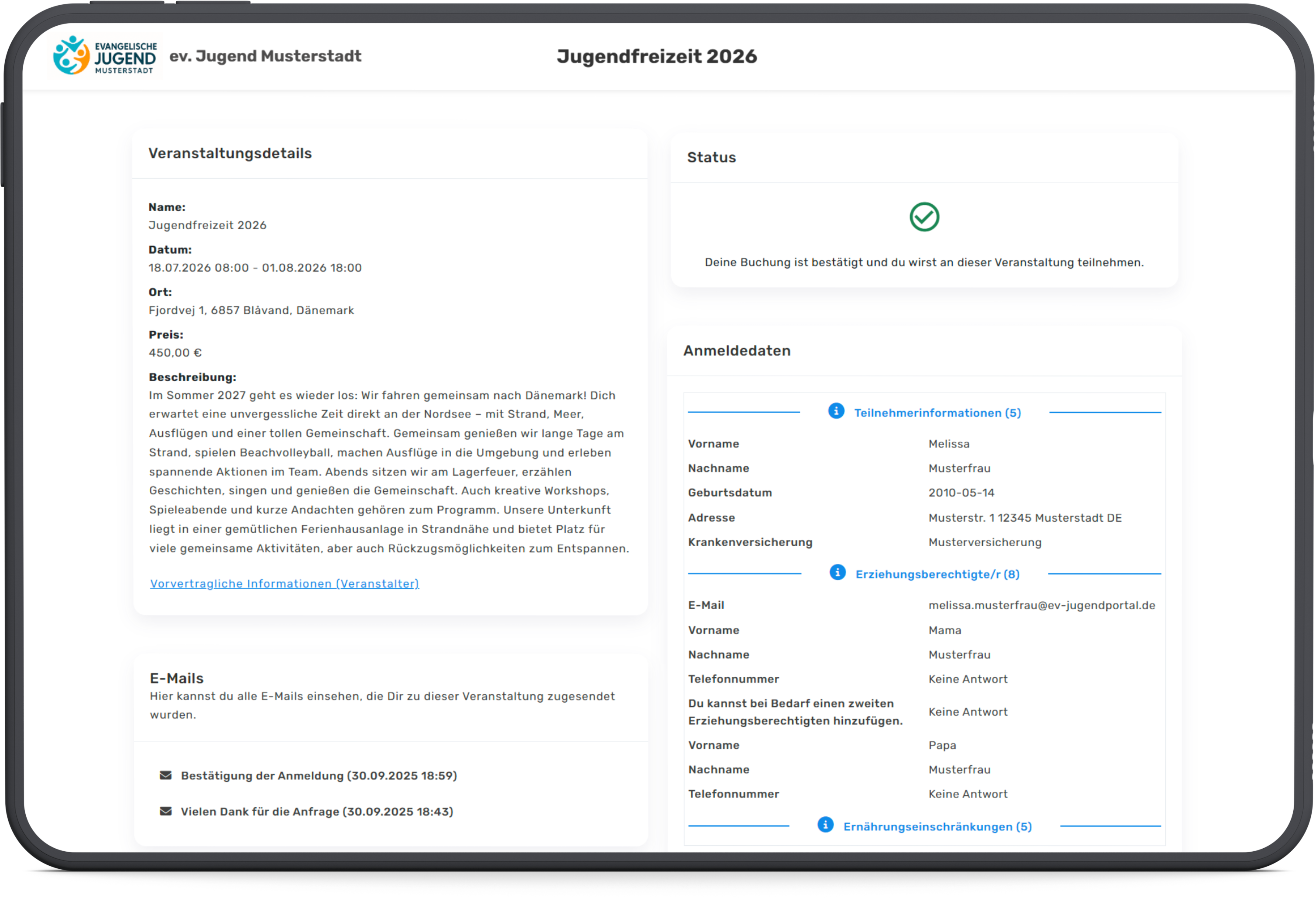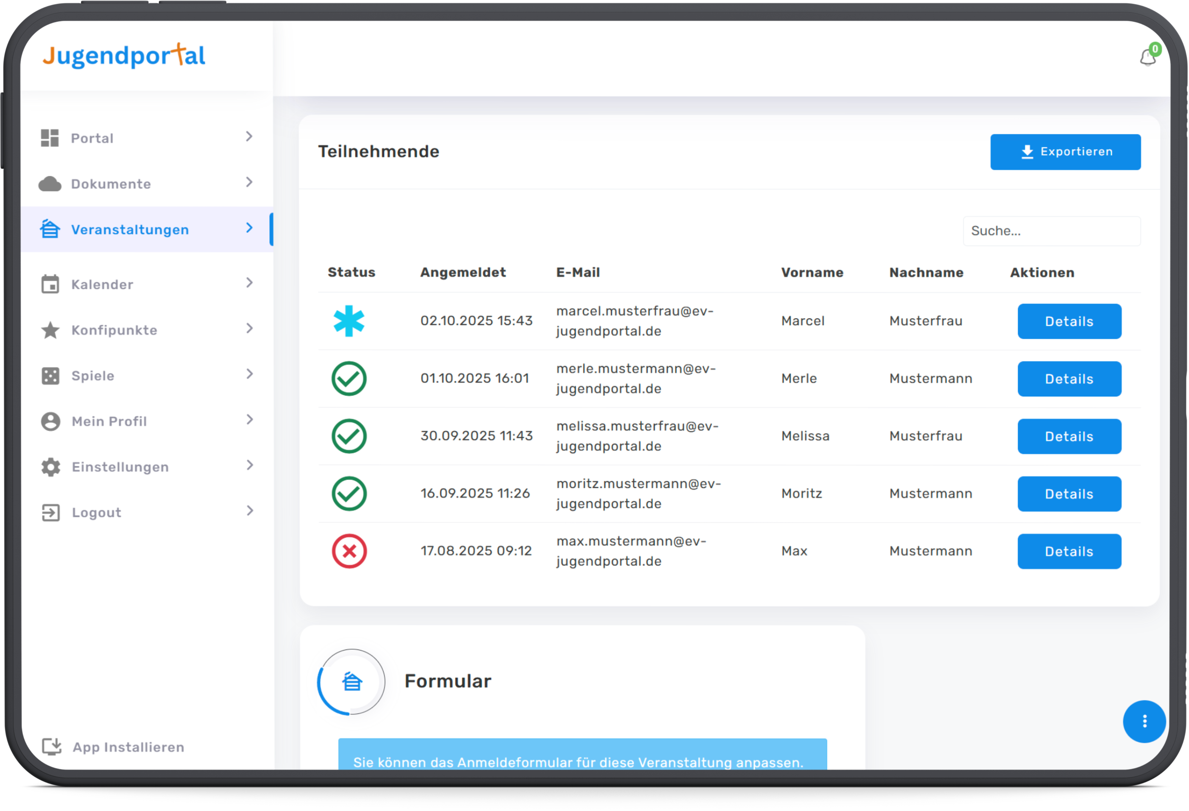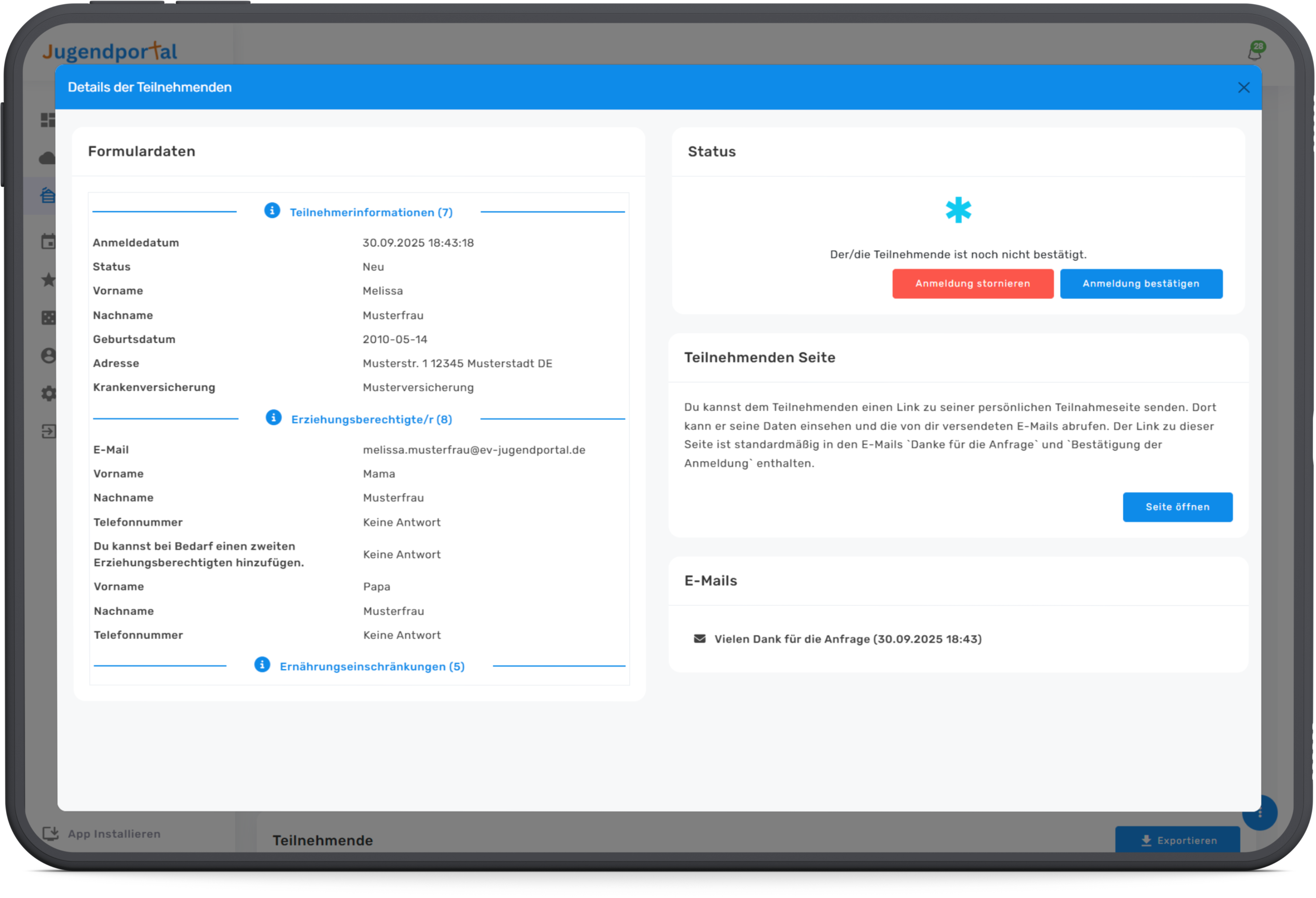 Im Jugendportal kannst du alle Anmeldungen und Daten zentral verwalten. Bestätige Anmeldungen, storniere Buchungen und sieh dir die Anmeldungen im Detail an.